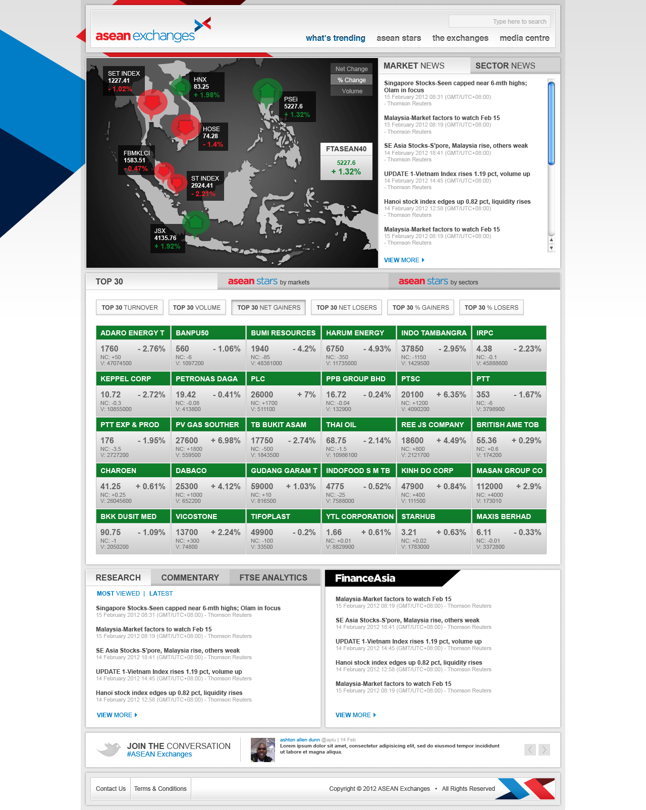 The role of this website is to visualise financial data from the 7 member exchanges around ASEAN. To do this, the site sucks in several feeds from Thompson Reuters and parses it for human consumption.